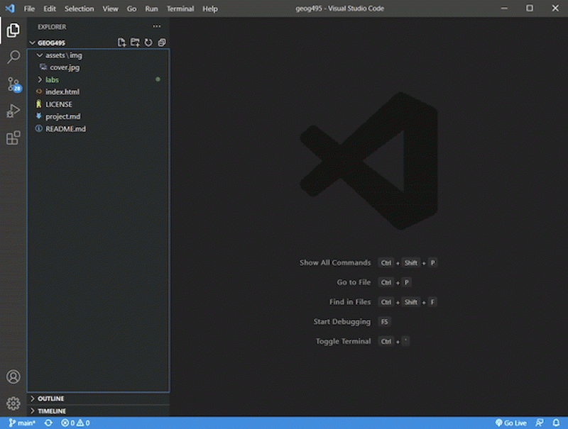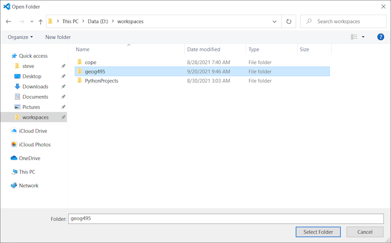 Once Visual Studio Code is opened, press ctrl+k and then ctrl+o to open the open folder window, navigate to geog595 folder from your workspace and press select folder. Then the geog595 repo will be opened, and a file tree will be shown in the project list panel on the left of the vscode window.