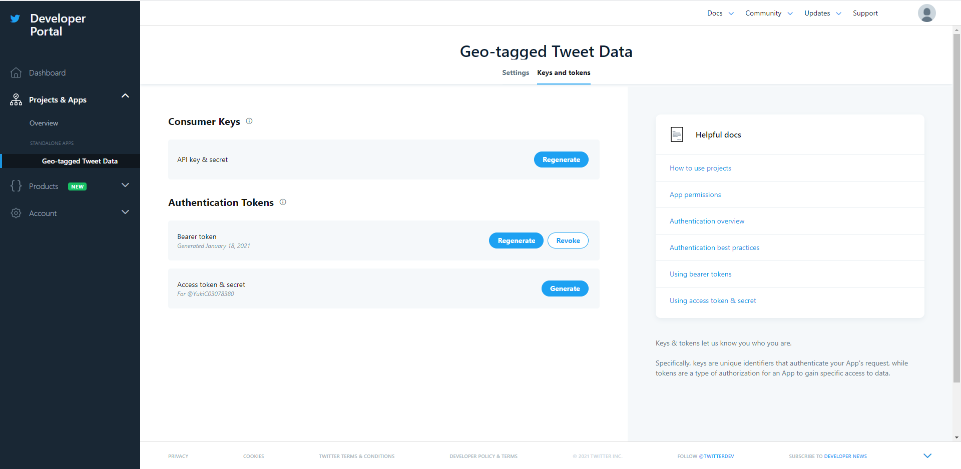 Once you are registered, you could check your own keys and tokens again by click on your app-name which is under your app list. Go to the App Detail of the app you just created. Click on the tab Keys and tokens, and you should be able to see all the keys and tokens required to use the Twitter API.
