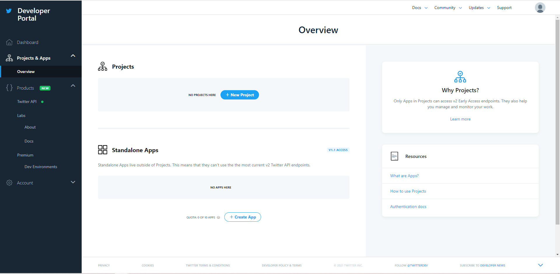 Then, you will enter developer portal. On the left bar, you can click on Projects & Apps for checking the list of apps that you’ve created for getting Twitter API, but for now, the list should be empty. In order to register for Twitter API, click on + Create App which is under the Standalone Apps.