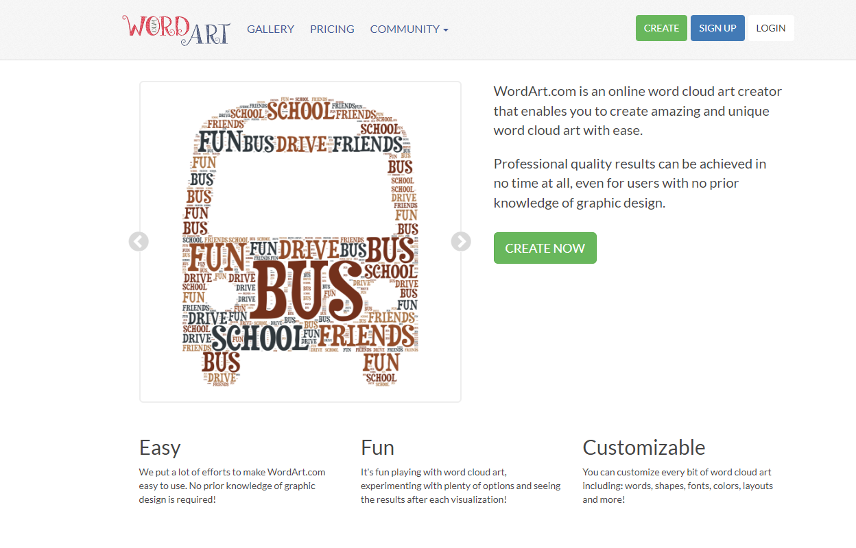 After registration, you can create a word cloud by pressing the “Create Now” Button on the front page.