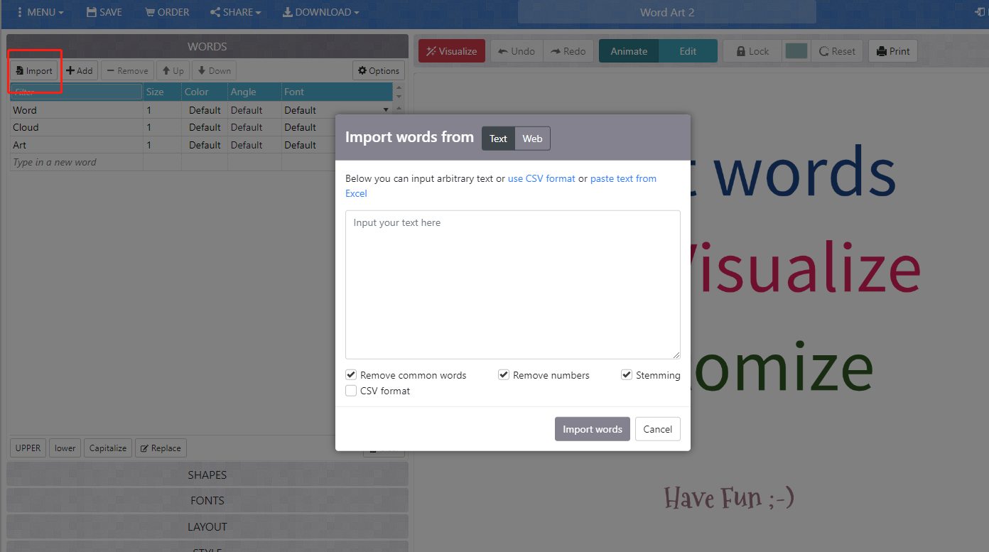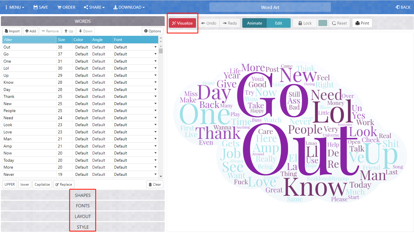 Now you will see a list of words on the left panel, please makes sure to delete those common terms or meaningless ones, otherwise your word cloud will be full of meaningless terms. Then, you can configure the rendering process through adjusting the shapes, fonts, layout, and style options. After you determine all the options, please type visualize on top of the main viewport. It takes a few second to render the image. After that, you will see the word cloud.