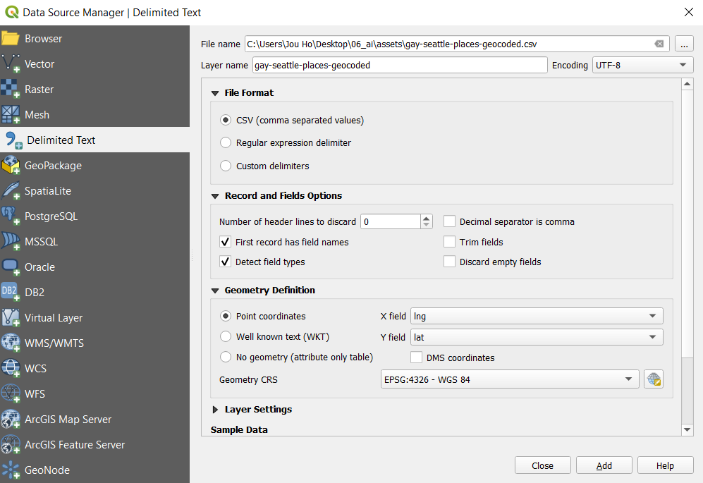 The rest is very similar to what we did ealier for geocoding. Once you have your empty project open, add our data by choosing Layer > Add Layer > Add Delimited Text Data. Choose gay-seattle-pnts.csv and the system should recognize xy fields for you this time. Leave all the settings default and click Add.