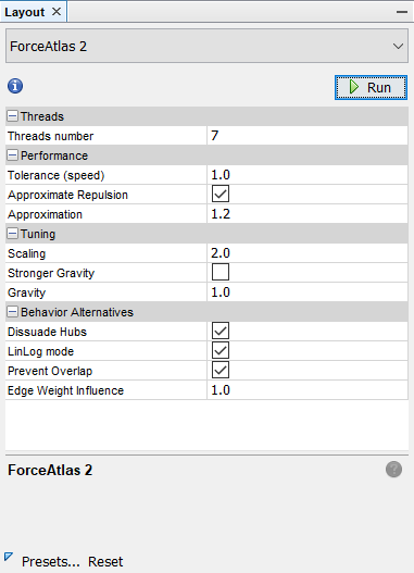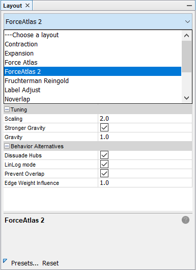 To change the layout, find layout window on the bottom-left of the screen. There are different layout methods you can choose from. Feel free to try different ones on your own, but let’s choose ForceAtlas 2 for this time.
