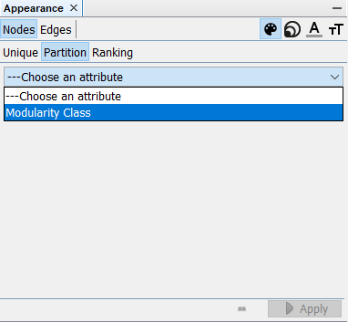 Now, navigate yourself to the top-left corner of the screen. You will see a Appearance window where you can edit the symbology of each nodes or edges. In order to classify our clusters based on modularity, click Nodes > Partition > Choose an Attribute, choose Modelarity Class and click on Apply.