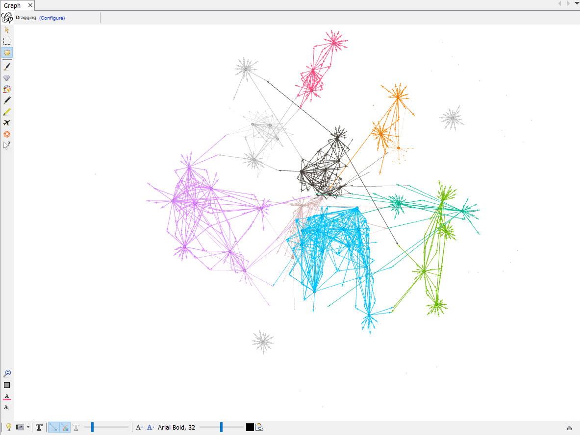 Click Applyand now we can see some nodes are bigger than others. These nodes have more connections than others and thus they are at the center of each classified clusters.