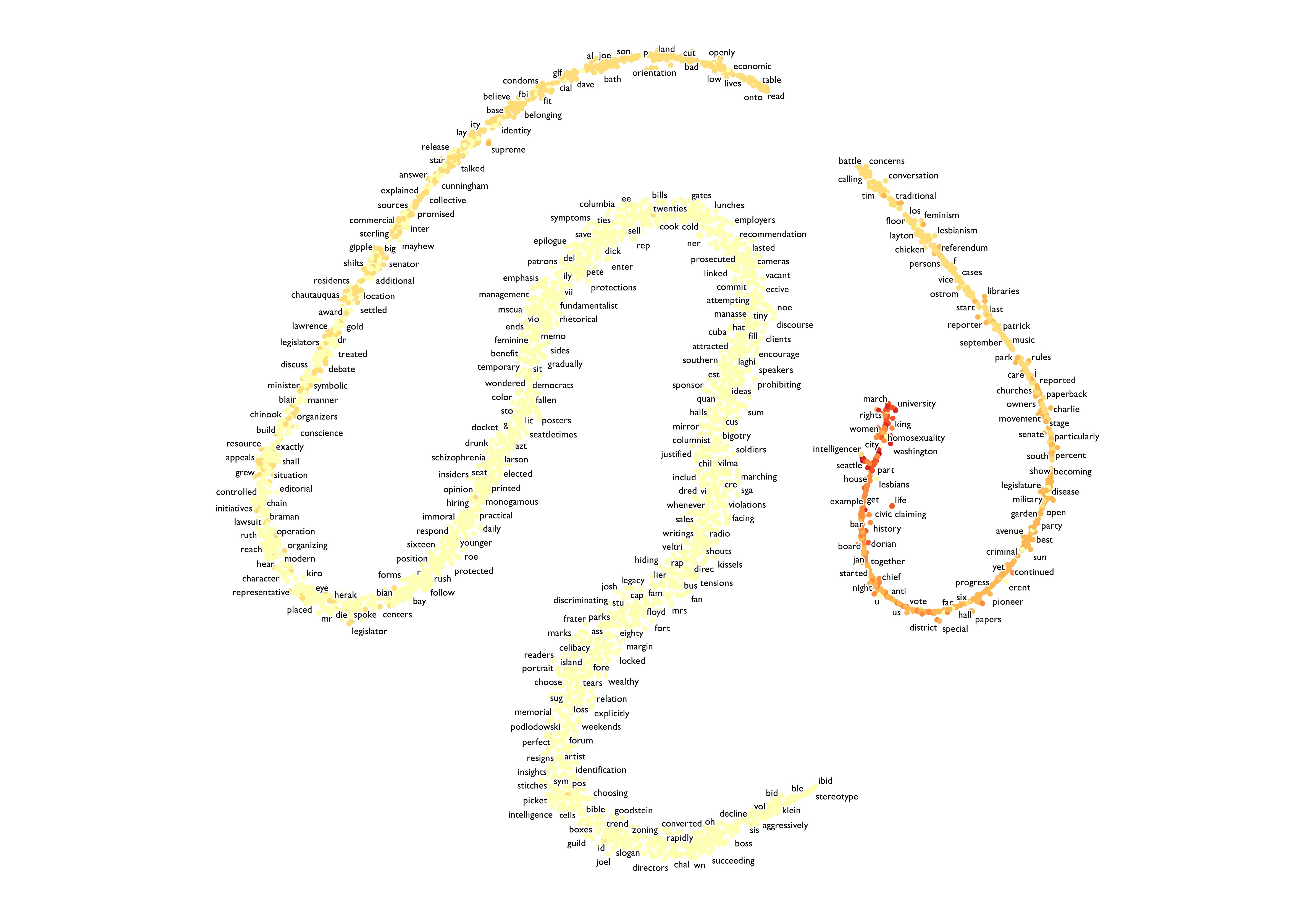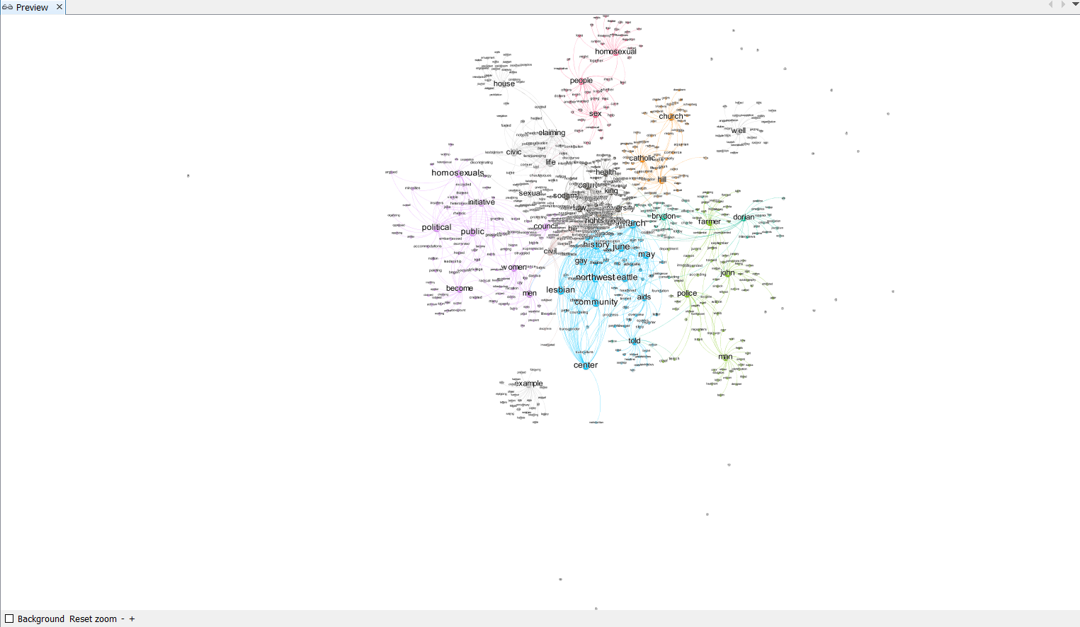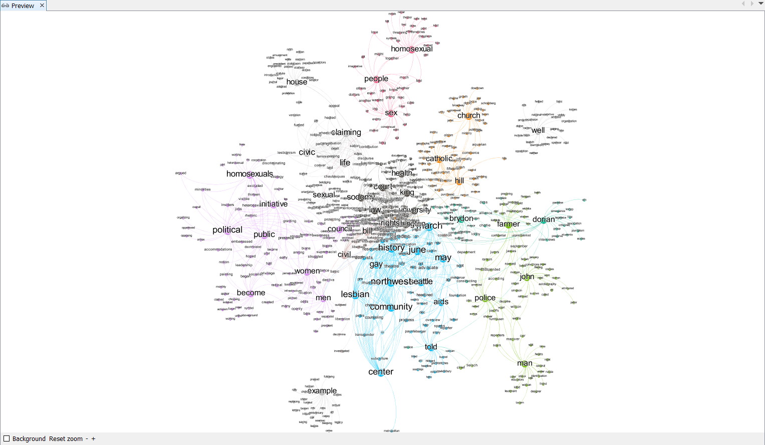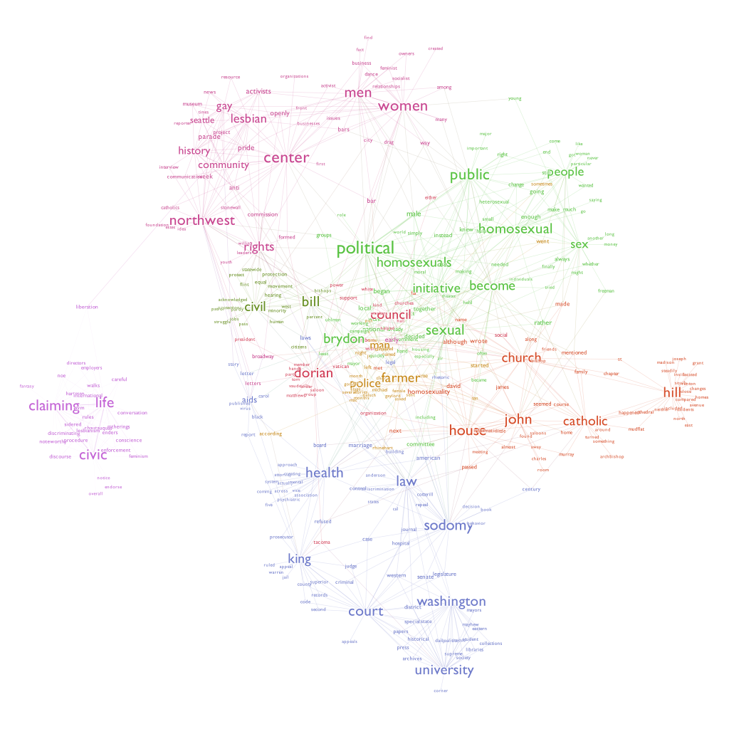This map shows how each words are tightly connected within the text that we have processed earlier. For example, the word homosexual, people, and sex are closely related. It may also be intersting to study why some of the words are closely related. For example, you may notice that police and farmer are put under the same cluster. Think about why this happens: are they closely related ithin the context of our book? or is it due to the algorythm of natural language processing?