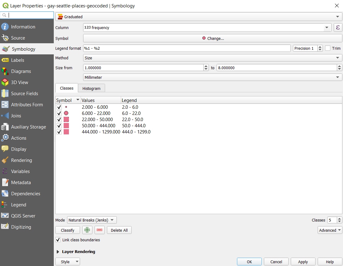 You should see a similar map you created using pyplot. Let’s change our symbology by left-clicking on the newly added layer and choosing properties > symbology. We can change each points’ color by their frequency variable. To do so, change single symbol to graduated symbol and choose freq for column variable. Classify them into different color ramps similarly to what we did for geocoding and hit apply. Now they are colored based on frequency.