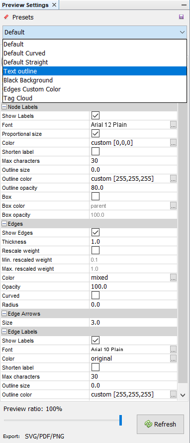 Now, let’s switch our page to Preview by clicking Preview on the top-left of the page. You probably do not have anything yet for your preview. We need to configure our preview first in order to generate a nice-looking social network map. Click Default and choose Text Outline and click Refresh.