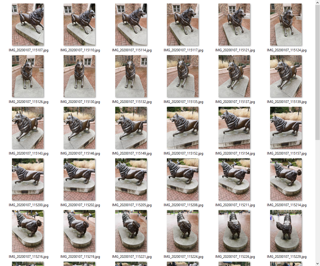 We are building a 3D model base on photo-scanning technology. Please use your phone or camera to take multiple images around your target. Ensuring the consistency of light is significant for creating a well-detailed model. The more pictures there are, the better the model would be. Example of taking photos are here:
