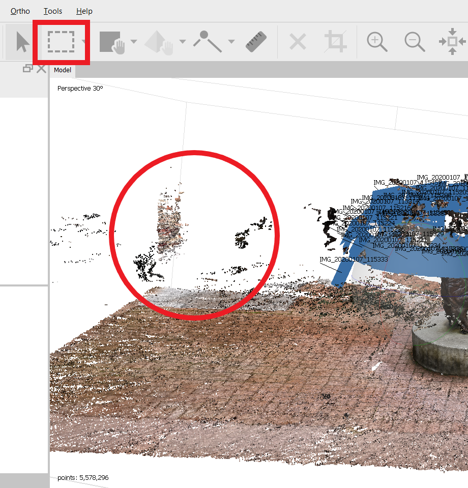 To complete the task of making a 3D model of the husky dog, I would strongly suggest you of using the Area Select tool in the red square and delete button on your keyboard to delete the unnecessary points. As you can see from the screenshot, the blue circled areas are irrelevant, those the position of the cameras.