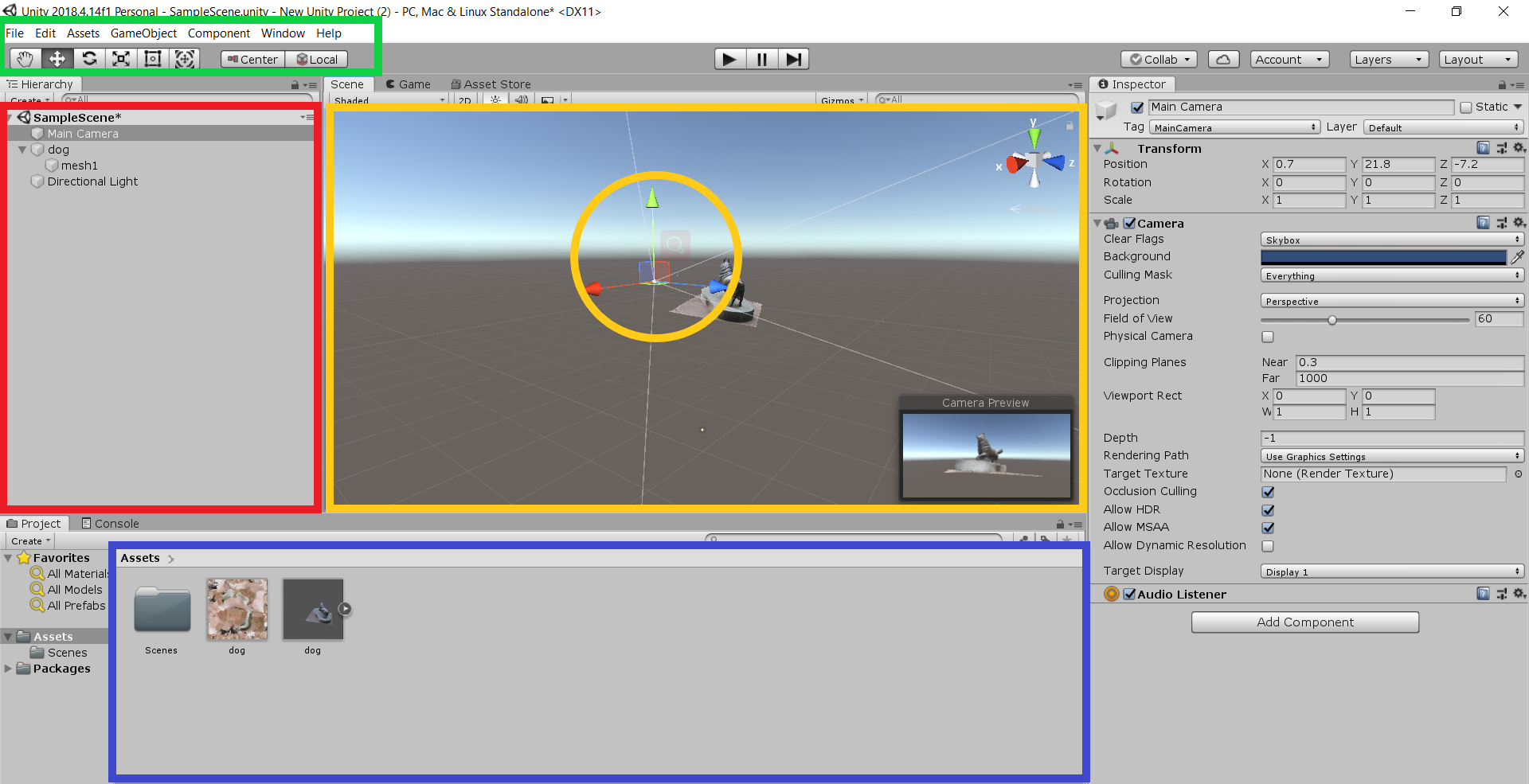 The red frame is the browsing panel. All your materials/object in the game shall be presented here. We recommend you to unpack all the prefab when you are importing the 3D model and texture. In this case, it is easier to access or manipulate your camera.