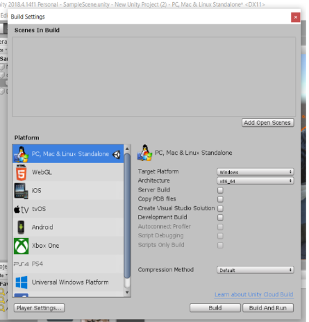 For windows Users, architecture X86-64 is good for most of the computer. You should leave the rest unselected (Sever Build, Copy PDB Build, Create Visual Studio Solution, and development Build). Also, leave it to default for Compression method. There are also a Player Settings on the lower left corner. You are welcome to change/adjust your intended equipment/icon by using the player setting. To change the VR equipment, you should find “XR Settings” under the Player Settings menu.*