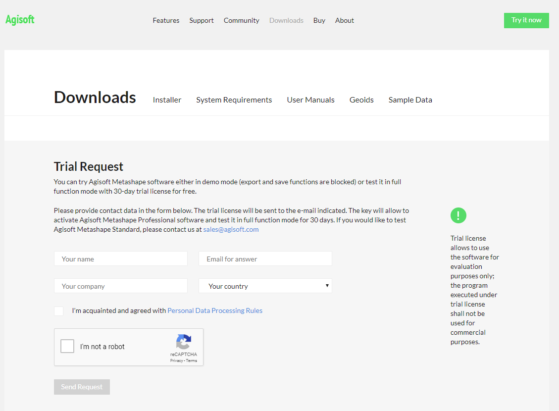You can try Agisoft Metashape software either in demo mode (export and save functions are blocked) or test it in full function mode with 30-day trial license for free. Visit here, and provide contact data in the opened page below. The trial license will be sent to the e-mail indicated. The key will allow to activate Agisoft Metashape Professional software and test it in full function mode for 30 days.