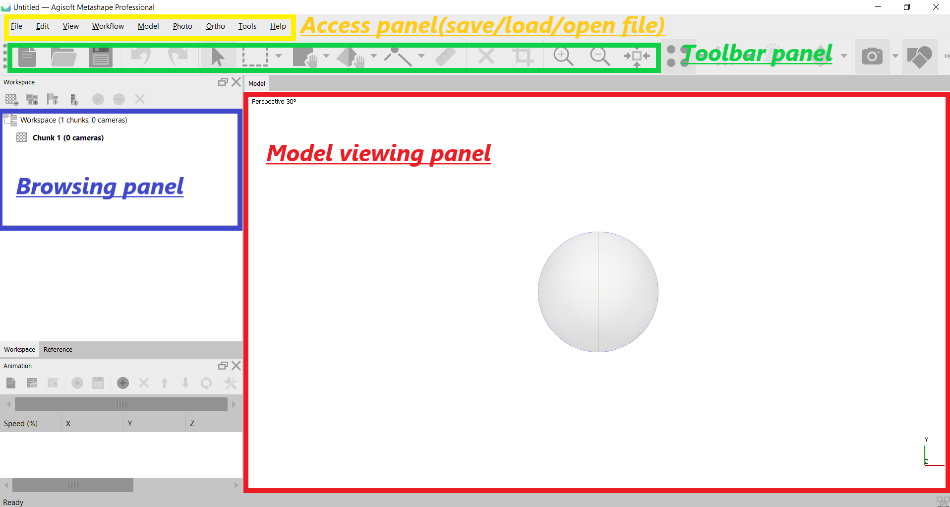 Once you open the software, you enter the main interface of this software. In this user interface, all of our operations are located on these four colored squares. The largest square with the red color is where our 3D model presents Model viewing panel. The circle in the center is a tool for us to navigate our 3D model. It has three-axis X, Y, Z. Use your mouse to drag on each axis for different angels.