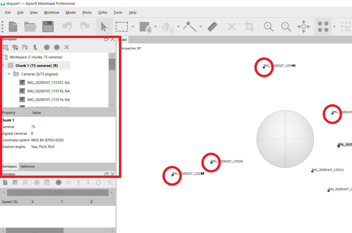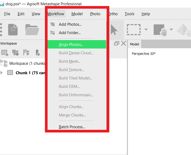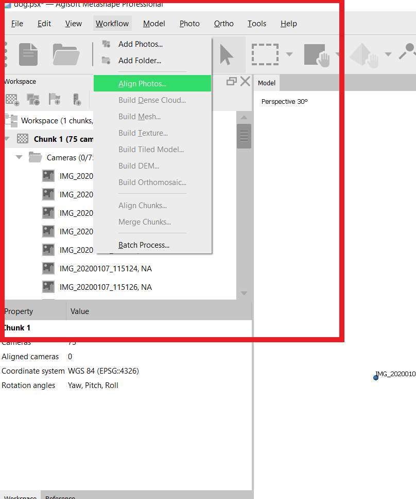 After you have added all the photos, you shall see them pop out on the workspace area - the red square on the left. You shall also notice the dots on your model interface. Each dot represents a virtual camera position, and the computer uses these dots to align photos for creating a 3D realistic environment.