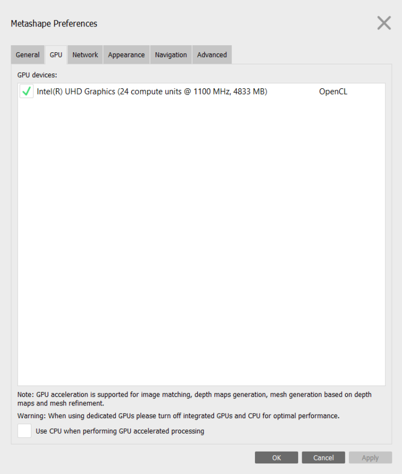 Here, you can change the language or all the default settings. You can check your GPU for the 3D modeling. I would recommend you to select the box for using CPU when performing GPU accelerated processing. Basically, this function splits the large amounts of work between GPU and CPU, and it should reduce your waiting time.